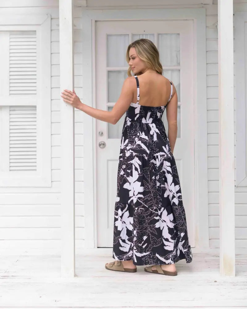 Con una silueta amplia y fluida, tiras ajustables y espalda con delicado recogido elástico, este vestido ofrece una mezcla perfecta entre comodidad y estilo. Su tela ligera y de caída natural realza un estampado en contraste blanco y negro que aporta elegancia y versatilidad. Ideal para climas cálidos, salidas casuales o looks de verano con un toque sofisticado. Una prenda atemporal que combina frescura, movimiento y feminidad.