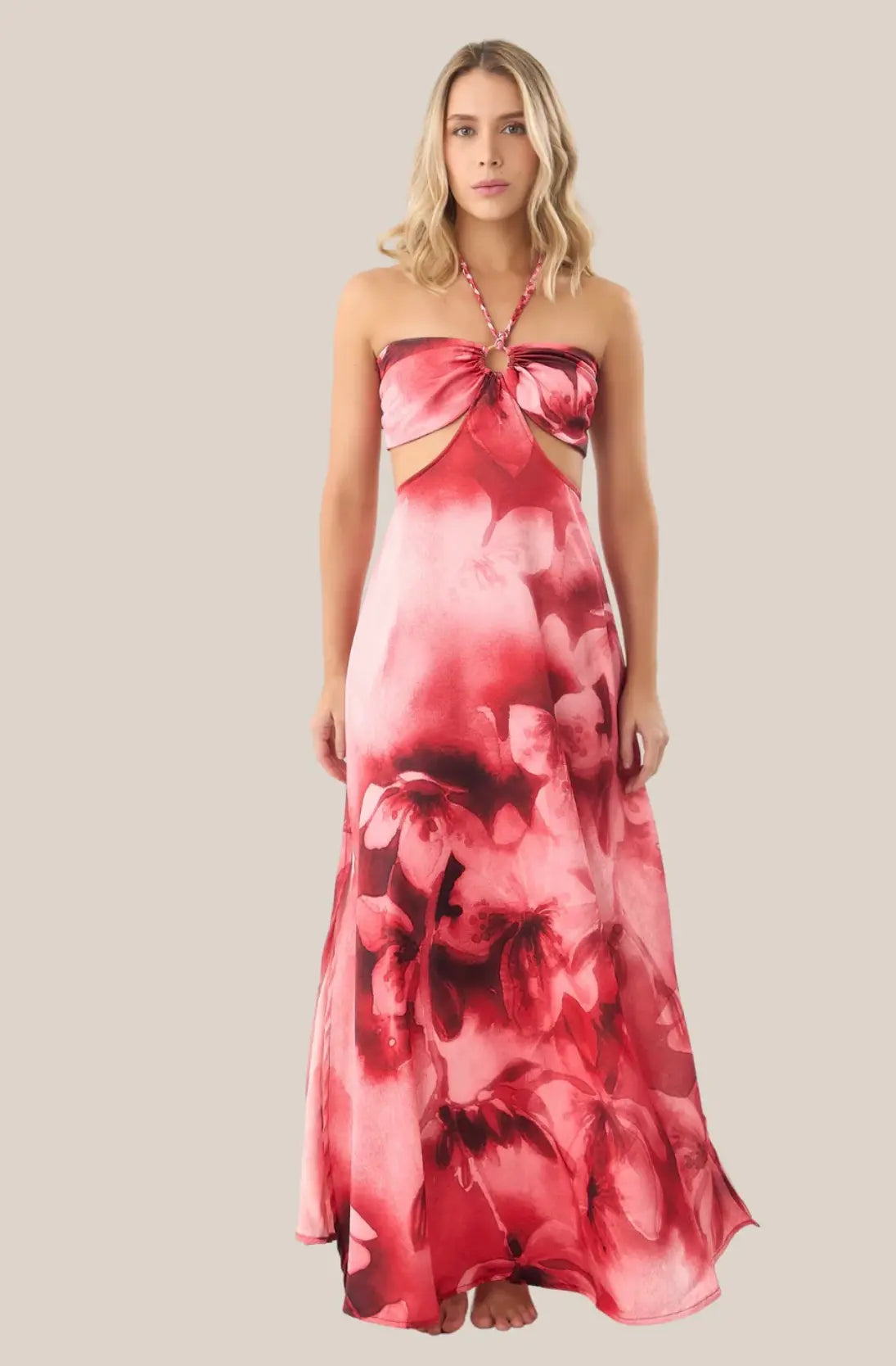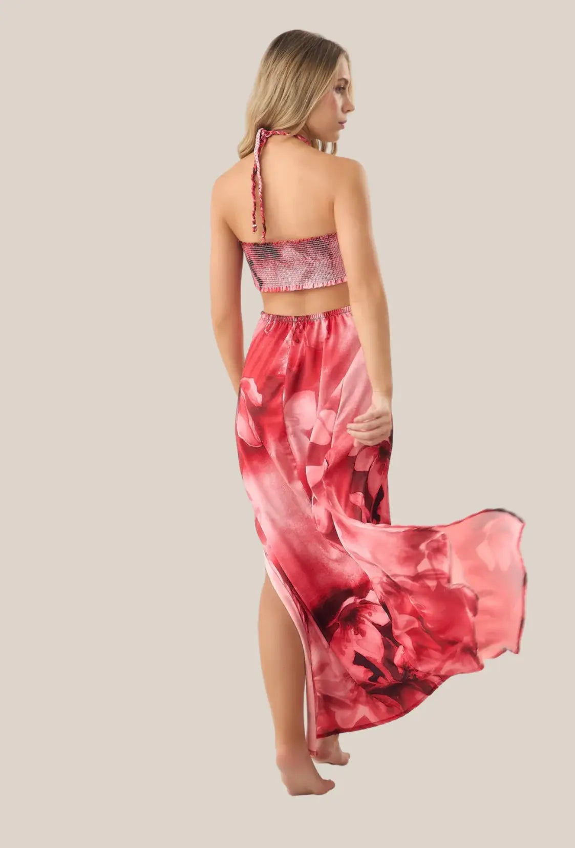 - Este vestido largo es la unión perfecta entre elegancia, movimiento y comodidad. Confeccionado en una tela fluida y ligera, su caída acompaña cada paso con gracia natural. El top strapless con detalle de anillo y la espalda en nido de abeja se adaptan con suavidad a diferentes cuerpos, permitiendo un ajuste flexible y cómodo.